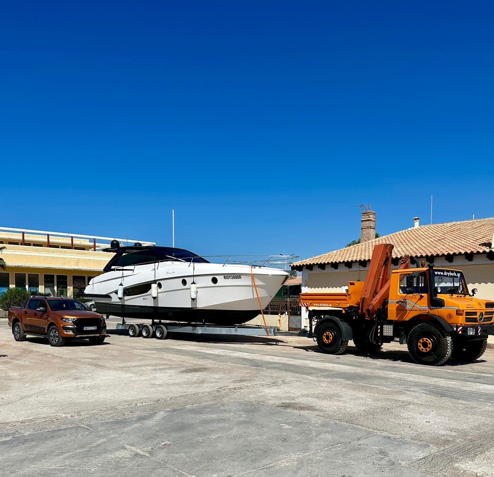 Στη διάθεσή μας έχουμε τρία φορτηγά ιδιωτικής χρήσης, τέσσερα 4x4, ενώ προχωράμε στην απόκτηση ενός Mercedes Unimog U 1700 για την εξυπηρέτηση μεγαλύτερων σκαφών, έως 45 πόδια και εως 20 τόνους.